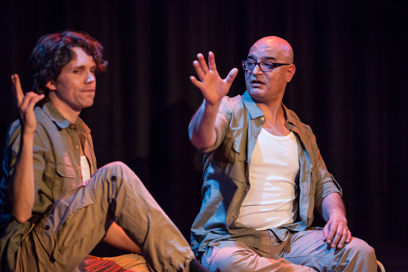 Krigsfortellinger-29.02.12-TMSogAM-FotoRavn-Heggerud-121Krigsfortellinger skaper nye og uventede forestillinger om en konflikt fra vår nyere historie, samtidig som den på et mer generelt plan tar for seg krigens sanne vesen. I løpet av forestillingen forteller Torgrim og Amir historier fra krigen som tidligere ikke har blitt fortalt. Krigsfortellinger balanserer mellom det svarte og det humoristiske, mellom det tragiske og det burleske, mellom det konkrete og det poetiske.