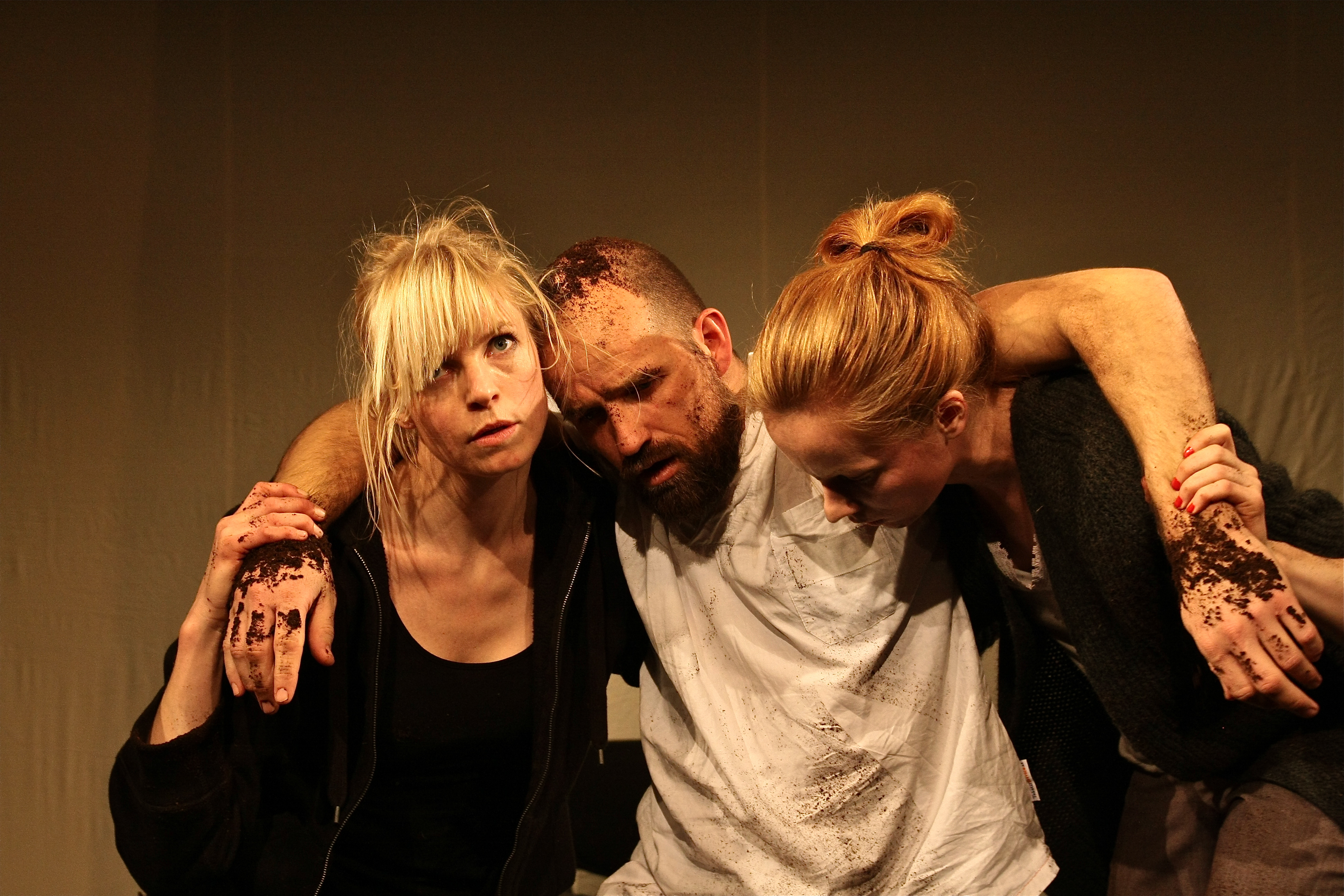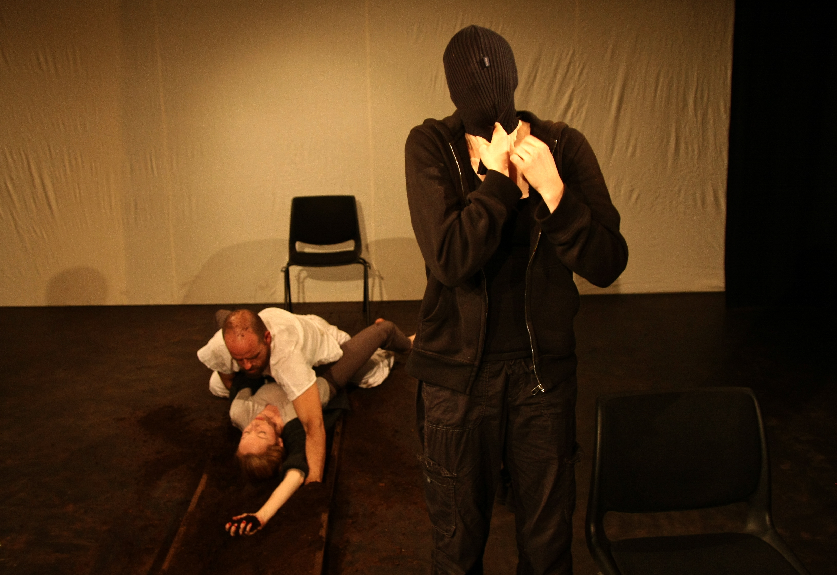 Scenografi: Hvitt bakteppe, to stoler & en lav kasse på 3 x 0.5 m fyllt med jord